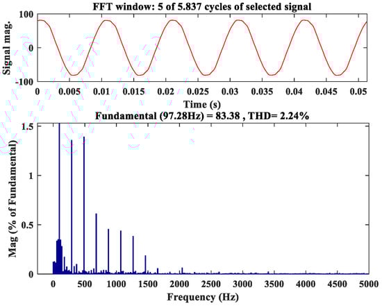 The PM flux linkage ( λ P M ) can be measured experimentally when the machine is working as a generator under no load. The no-load back EMF voltages are measured and recorded, preferably at high speeds. The higher speed is preferred to have a higher voltage on stator windings. The measurement errors in the case of a higher voltage range are lower compared to the case of lower voltage. Hence, high speed is preferred to reduce the measurement error in phase voltages and hence to estimate accurately the flux linkage of permanent magnets. λ P M can be estimated using Equation (8). Due to the concentrated windings configuration, the fundamental component of phase voltage must be considered. Hence, Fast Fourier Transform (FFT) is conducted for the phase voltage, as seen in Figure 4.