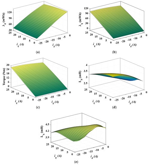 Figure 6 shows the flux-linkages (λd (id, iq, θi), λq (id, iq, θi)), torque Te (id, iq, θi), and inductances (Ld (id, iq, θi), Lq (id, iq, θi)) as functions of id, iq at θi = 0. As seen, the flux linkages, torque, and inductances show highly nonlinear relations with currents. As seen in Figure 6, the d- and q-axes inductances (Ld, Lq) decrease with the increase of q-axis current iq over the full range of d-axis current id.