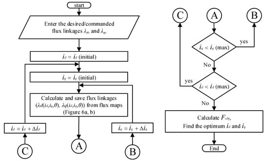 Equation (11) is used to represent the error between required fluxes (λdo and λqo) and actual fluxes, λd (id, iq, θi) and λq (id, iq, θi), that correspond to currents id and iq. The currents id and iq are obtained by minimizing the objective function Fobj using an iterative process in which λd and λq are interpolated on FEA-calculated flux maps. Figure 7 shows the flowchart of this process. First, the desired or commanded fluxes (λdo and λqo) are inputted. Then, the currents (id and iq) are changed with small steps (Δid = 0.1 A and Δiq = 0.1 A). for each value of currents (id and iq) within the iterative process, the fluxes are estimated from the flux maps of Figure 6. Finally, the objective function is estimated for obtained current and flux vectors, and then the currents (id and iq) that corresponds to minimum flux error (minimum Fobj) are output as the optimal solution of currents. Figure 8 shows the obtained optimal id and iq currents after the Inverse solution of currents versus flux linkages.