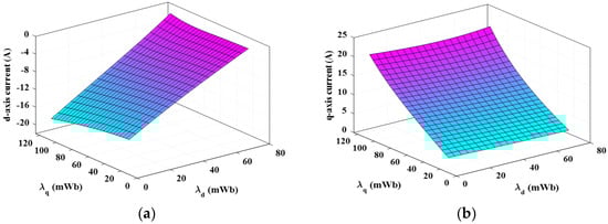 The proposed machine model that is given in Figure 2 consists of three main parts: first, the torque estimation Te (id, iq, θi), which is a straightforward task, as the obtained data from FEA can be stored in the form of a 3D LUT; second, the representation of iron losses by the currents id-fe and iq-fe, which is included in a later section; and third, the estimation of currents id (λd, λq, θi) and iq (λd, λq, θi). As noted, this is an inverse solution for the obtained data from FEA. The FEA gives the fluxes as functions of currents and positions. The required the characteristics id (λd, λq, θi) and iq (λd, λq, θi) to be in the inverse form; the currents are functions of fluxes and positions.