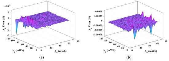 The obtained id and iq currents of Figure 8 are inputted to flux maps (Figure 6a,b). The resultant fluxes are compared to their corresponding flux values. The flux errors are shown in Figure 9. As noted, the maximum error is very small and can be ignored. The small error reflects the accuracy of the inverse solution and hence the accuracy of the proposed model.