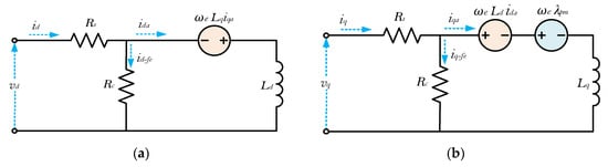 Figure 10. The d- and q-axes equivalent circuits of an IPMSM with iron losses: (a) d-axis, (b) q-axis.