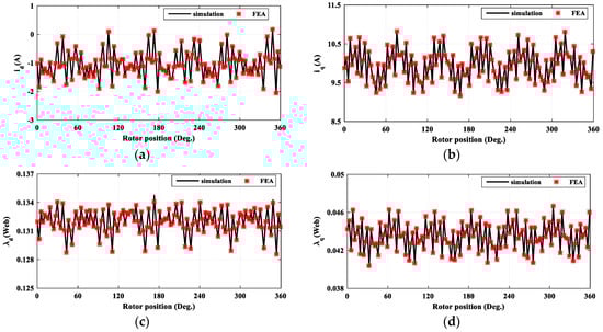 To consider only the magnetic saturation, the d- and q-axes inductances (Ld, Lq) are presented as functions of id and iq. The obtaining of such relationships is not an easy task; several measurements must be conducted, which complicate the idea of obtaining a high-accuracy model for an IPMSM [30].