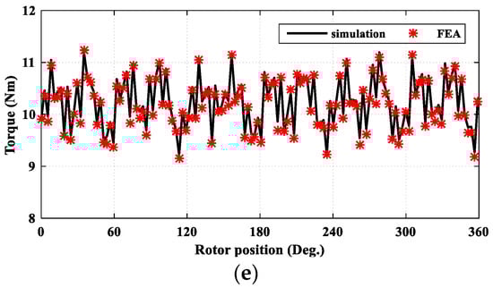 Figure 6. The FEA-calculated (a) λd, (b) λq, (c) torque, (d) Ld, and (e) Lq.