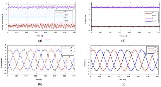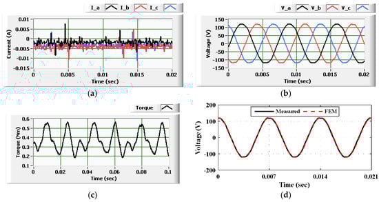 Second, the motor was operated under a steady state condition with reference currents id-ref = 0 and iq-ref = 3.5 A. The loading torque was adjusted to reach a speed of 555 r/min. The measured waveforms were recorded, as seen in Figure 17a–c. Then, the same case was simulated within the MATLAB Simulink model. The simulation results are given in Figure 17d–f. As noticed, very good agreement was observed between measurement and simulation.