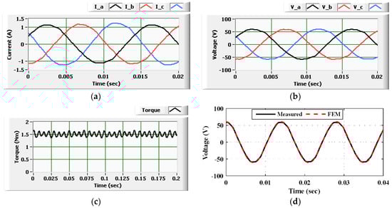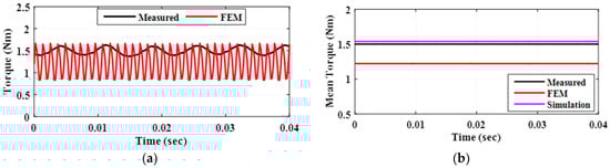 Table 4 gives the torque analysis data. It compares the measured and the simulated torques. The torque error was 3.26% which may be a result of measurement errors. Moreover, the mechanical coupling between the IPMSM and loading magnetic brake could be a primary reason for torque error, as improper mechanical coupling could affect friction losses. As a result, the proposed model is accurate enough to represent real machine performance.