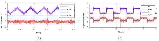 Figure 16. The measured waveforms: (a) the measured d- and q-axes currents with iq-ref is changing as a triangular wave; (b) the measured three-phases’ currents with iq-ref is changing as a triangular wave. (c) the measured d- and q-axes currents with id-ref and iq-ref changing as square waves; (d) the measured three-phases’ currents with id-ref and iq-ref changing as square waves.