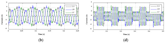 Finally, experimental tests for the IPMSM in motoring action were achieved based on the FOC algorithm. The dc link voltage was set to 200 V. First, the FOC algorithm was tested to ensure proper tracking operation. Figure 1 shows the performance of the FOC algorithm under sudden changes of reference currents (id-ref and iq-ref). As seen in Figure 16a,b, iq-ref changed as a triangular wave at a frequency of 20 Hz. The motor speed was 486 r/min. As seen in Figure 16c,d, both id-ref and iq-ref changed as square waves at a frequency of 10 Hz. The motor speed was 488 r/min. As noted, for both cases, the FOC algorithm worked efficiently, as the motor could track the reference d- and q-axes currents properly. Moreover, the three phases currents were symmetric and sinusoidal.