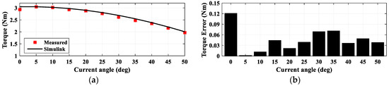 Figure 18. Comparison between the measured and simulated torque vs. current angle: (a) measured and simulated torques vs. current angle; (b) torque error in Nm; (c) percentage torque error.
