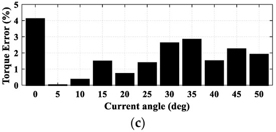 Figure 18 shows a comparison of the measured and simulated torque versus current angle. The current angle was changed from 0° to 50° in steps of 5°. The maximum current was set to 3 A. The motor was running in an open loop current control. The motor speed was adjusted by the loading dc brake. The test was done at 500 r/min. As noted, due to the reluctance torque of IPMSM, the maximum torque did not occur at a zero-current angle, such as in surface-mounted PMSM. As seen, the maximum torque occurred around a 5° current angle. Moreover, very good agreement was observed between measurement and simulation, as seen in Figure 18a. The maximum torque error over 11 points of comparison was 0.12 Nm at a current angle of 0°, as illustrated by Figure 18b. It corresponded to an error of 4.1%, as seen in Figure 18c. On the other hand, the average torque error over 11 points of comparison was 0.0449 Nm, which corresponded to a percentage of 1.7422%, which is a small error and could be a result of measurement errors, assumptions in the FEA model, variations of dc voltage, or effects of temperature on machine parameters such as magnets and resistance.