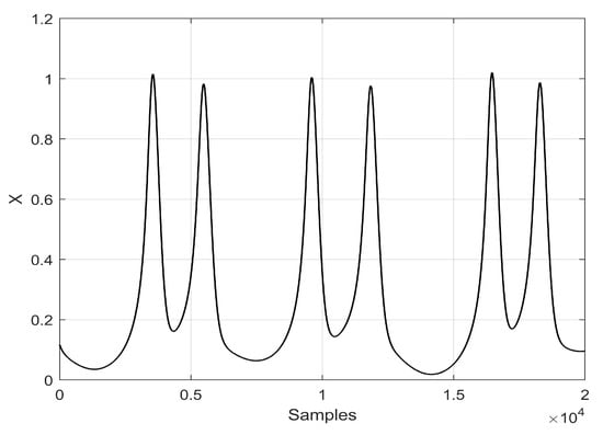 The HRN model represents snail neurons obtained by voltage-clamp experiments. It is simple and easy to implement and can effectively simulate a molluscum neuron’s repetitive and irregular behavior. It also has many neuronal behavioral characteristics such as periodic peak discharge, periodic cluster discharge, chaotic peak discharge, and chaotic cluster discharge [35]. The HRN model is given in (10) [28], where x is the neuronal membrane voltage, y is the recovery variable associated with the current in the neuronal cell, z is the slow adaptability current, and the other parameters can have the following values to generate chaotic behavior: , , , , , , , and [28]. Figure 3 shows the chaotic time series of the variable x of the HRN.