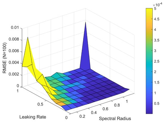 For the selection of the ESN hyperparameters to predict the time series of the Lorenz system, we used the grid search method, varying the leaking rate and spectral radius, with 100 neurons in the reservoir. According to the recommendation mentioned in Section 2.1, there should be between 1000 and 5000 neurons for a training dataset of 10,000 points; however, we sought to increase the prediction horizon with the least number of neurons possible. The matrices and were randomly generated from a range of , and was re-scaled according to the spectral radius to guarantee the echo state property and fully-connected topology. Figure 5 shows the results of the grid search, where it can be seen that for large values of the leaking rate and spectral radius, the root-mean-squared error (RMSE) tended to increase.