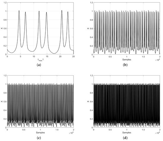 Chaotic time series of Lorenz system: (a) without decimation , and with (b) , (c) , and (d) .