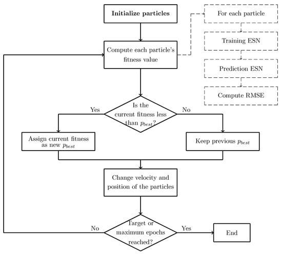 In this work, we show the time-series predictions of two chaotic systems, namely the Lorenz system [27] and the Hindmarsh–Rose neuron (HRN), which has slow dynamic behavior [28]. We show the use of ESNs as an ML technique with the goal of improving the prediction horizon. The horizon is highly improved by decimating the time series without affecting its dynamical characteristics, such as the Lyapunov spectrum and Kaplan–Yorke dimension. The prediction horizon is also increased by optimizing the reservoir input matrix of the ESN , applying the particle swarm optimization (PSO) algorithm. It is highlighted that in all the experiments, our work considers a small reservoir size compared to similar works, making our proposal more efficient in terms of computational costs. The paper concludes by showing a comparison of our results and related studies, observing a similar or even a much better prediction horizon with very few neurons. The remainder of the document is structured as follows. Section 2, describes the topology of the ESN and PSO algorithms. Section 3 describes the datasets used for the times-series prediction. Section 4 presents the technique for the chaotic time-series prediction using ESN without optimization. Section 5 shows the prediction results of the optimized ESN with different decimation cases. Finally, the conclusions are summarized in Section 6.
