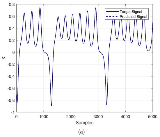 Figure 2a shows that the dynamic range of the Lorenz system is . However, for appropriate predictions using ML as the ESN with the activation functions as the hyperbolic tangent, it is recommended to use data within a dynamic range , as shown in [18]. For this reason, the Lorenz system is scaled making the change of variables given in (8) into (7).