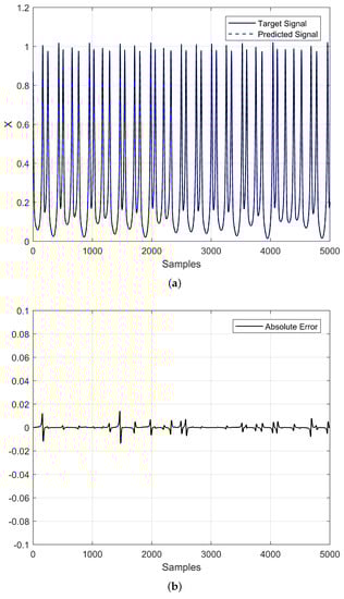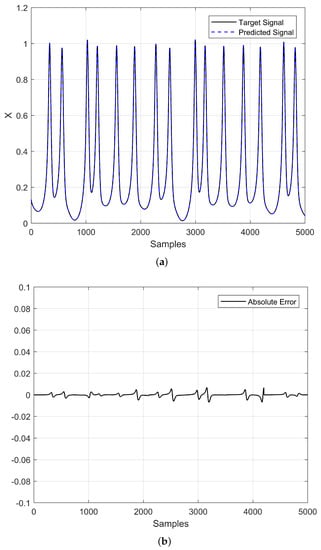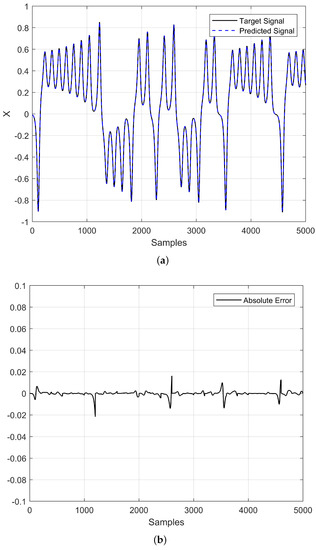 Time-series prediction (Lorenz system) using an optimized ESN with . (a) Predicted time series and target signal, and (b) Absolute error.