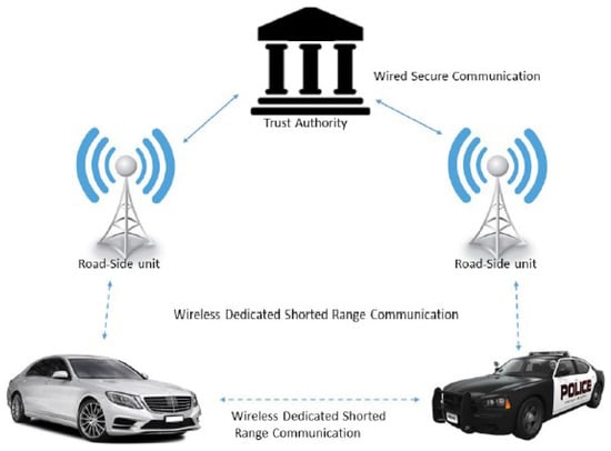 Due to gateways and wireless routers, wireless ad hoc networks (WANETs) are decentralized wireless networks that do not possess any preexisting architecture, such as wired networks. WANETs are further subdivided into two types: mobile ad hoc networks (MANETs) and VANETs. MANETs establish connections between different portable devices, whereas VANETs communicate with vehicles and RSUs as shown in Figure 1 [5,6]. VANETs are becoming popular because they provide V2V, V2I, and I2V communication. VANETs are brilliant solutions for accident prevention, traffic control, toll payment, transmitting relevant information for security updates, and weather monitoring notifications. There is no fixed infrastructure in such ad hoc networks, which results in security issues in VANETs [7]. The challenges include safeguarding drivers’ personally identifiable information; banking information; the confidentiality of incoming messages; private information; and the safety of keys saved in intelligent transportation systems.