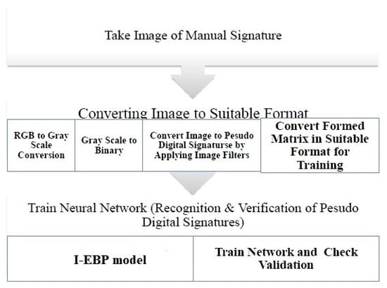 The idea is to generate manual signatures into pseudo-digital-signatures and then analyze them for validation using an ANN’s I-EBP model. The simulation was carried out in MATLAB using the Neural Network Toolbox. The driver’s manual signatures were collected on white paper, and these manual signatures were then translated into a soft form using two techniques. The first step involved merely clicking the image and saving it to a separate directory on the vehicle’s microcontroller. Second, this application required a smartphone camera for real-time capturing by utilizing the Image Acquisition Toolbox. The captured images by this framework were also saved in a specific location on the storage device. Different morphological approaches were then used to transform these image data into a new format. The classified format images were unrecognizable and were utilized as a pseudo-digital-signature in VANETs to verify the communicator’s authenticity. Following that, the network was trained using the I-EBP method of the ANN to shorten the identity verification. The system learned quickly and validated the pseudo-digital-signatures. Figure 4 depicts the process of converting a manual signature to a pseudo-digital-signature.