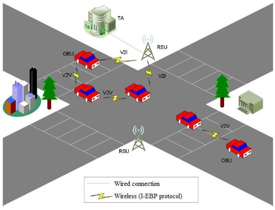 - RSU: An RSU is a component of vehicles and infrastructure that is permanent. The RSU can share information with the vehicle’s OBU and the TA via the I-EBP protocol and ensure secure wired connectivity, respectively. The RSU can inform the driver about vehicular traffic conditions such as heavy traffic and collisions. Notifications about traffic from the signatory, i.e., the driver, may also be authenticated and conveyed to the TA or applied on their own.