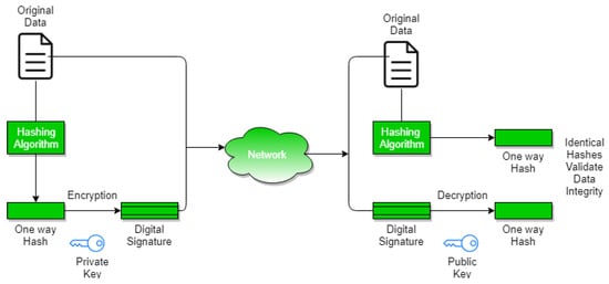 - Entity authentication: It can be done at the receiver end. The receiver will be able to authenticate the identity of the sender and their activeness during communication or in the network [15,16].