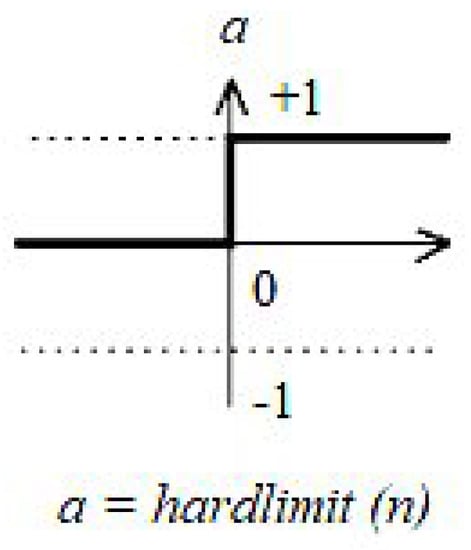 - Activation: The result was fed into an activation function (transfer function), which converted input values to output values. The enhanced perceptron model could be trained using 2 types of training and learning functions. We could not use the symmetric hard-limit transfer function as its output was 1, if the net threshold was achieved, otherwise, the output would be −1. We were working on binary values and bound to produce 0 and 1, that was why we could not use this transfer function. We trained the proposed network with all discussed possibilities. Table 2 shows the various functions used during the training. Figure 7 shows the hard-line (hard-limit transfer) function.