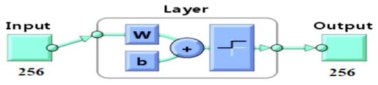 During the learning stage, the enhanced perceptron model was used to attain the private key. The 256 × 8 matrix key form was used as an input value as well as the network’s target value. The output of an enhanced perceptron model could be 0 or 1. If the input transfer function was equal to or greater than 0, the enhanced perceptron neuron output was 1, otherwise, it was 0.