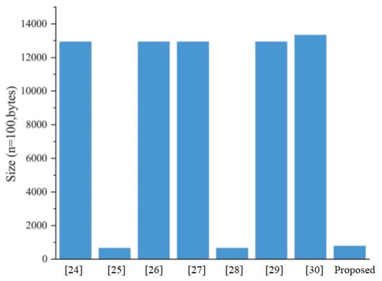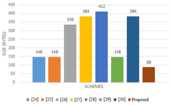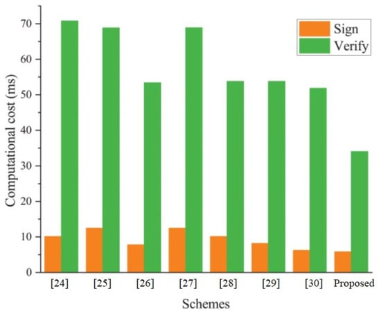 Figure 17 shows that the computation overhead yielded by the proposed scheme was lower than that generated by schemes [24,26,27,29,30], and significantly higher than that yielded by schemes [25,28]. However, when compared to schemes [27,30], the proposed system had a lower computation overhead.
