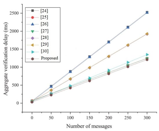 To assess the calculation of computational overhead of the proposed and existing VANET methods [24,25,26,27,28,29,30], Figure 15 depicts the computational overhead of signing and validating one message using one of the currently available techniques. As shown in Figure 15, the proposed approach had a reduced computing cost between the signature creation and single signature verification compared with the other existing VANET techniques. Figure 16 depicts the overall verification delays of the existing schemes considered in this work. The aggregate verification latency appeared to rise linearly with the number of signatures. Figure 17 shows the aggregate signature size of the proposed and existing schemes.