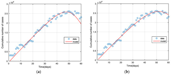 Data fitting of the model (3)–(12) to the actual data: (a) susceptible with vaccinated fitting; (b) susceptible with unvaccinated fitting.
