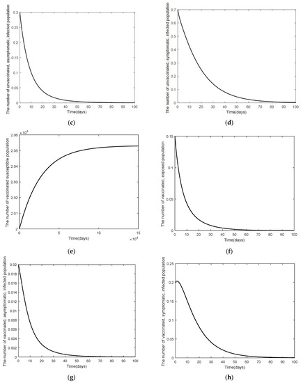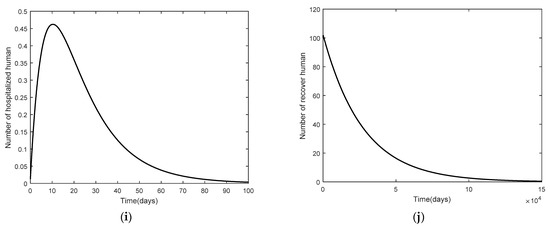 Graphs of the system of Equations (3)–(12) at the disease-free equilibrium point of , and when : (a) the number in the unvaccinated, susceptible population; (b) the number in the unvaccinated, exposed population; (c) the number in the unvaccinated, asymptomatic, infected population; (d) the number in the unvaccinated, symptomatic, infected population; (e) the number in the vaccinated, susceptible population; (f) the number in the vaccinated, exposed population; (g) the number in the vaccinated, asymptomatic, infected population; (h) the number in the vaccinated, symptomatic, infected population; (i) the number in the hospitalized population; and (j) the number in the recovered population.