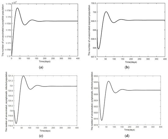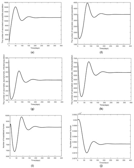 Graphs of the system Equations (3)–(12) at the endemic equilibrium point of , and when : (a) the number in the unvaccinated, susceptible population; (b) the number in the unvaccinated, exposed population; (c) the number in the unvaccinated, asymptomatic, infected population; (d) the number in the unvaccinated, symptomatic, infected population; (e) the number in the vaccinated susceptible population; (f) the number in the vaccinated, exposed population; (g) the number in the vaccinated, asymptomatic, infected population; (h) the number in the vaccinated, symptomatic, infected population; (i) the number in the hospitalized population; and (j) the number in the recovered population.