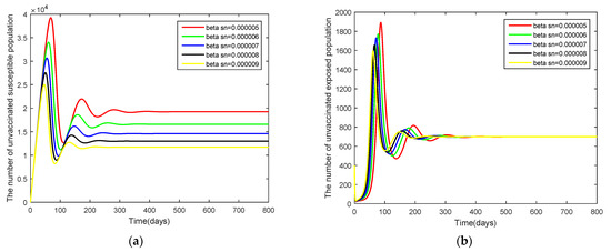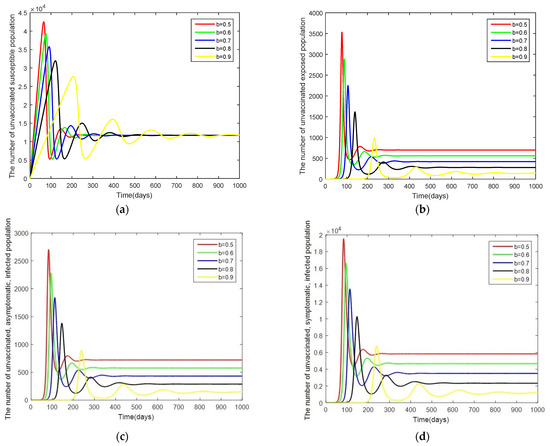 The World Health Organization defines the efficacy of vaccines as an overall measure of the ability of the vaccine to reduce the chance of getting infected, the death rate, the severity of the illness, the prolonged hospitalization rate, and the ability of the vaccine to creating herd immunity. The efficacy of vaccination depends on numerous factors, such as individual basic health status, individual age when getting the vaccination, or previous exposure to the disease. All factors have effects on the efficacy of vaccines. The effects of the parameters affecting the spread of COVID-19 are shown in Figure 5, Figure 6, Figure 7, Figure 8 and Figure 9. Figure 5 shows the comparison of the efficacy of vaccination by comparing the trajectories for the cases of b = [0.5, 0.6, 0.7, 0.8, 0.9] while keeping the other parameters as given in Table 2. Looking at plots in Figure 5a–d, we see that the graphs overlap. When these graphs are magnified, we see that the number of unvaccinated states, , decrease when the efficacy of the vaccines is increased. Another factor affecting the spread of COVID-19 is the infection rate as seen in Figure 6, Figure 7, Figure 8 and Figure 9. To investigate these cases, we look at the following cases: