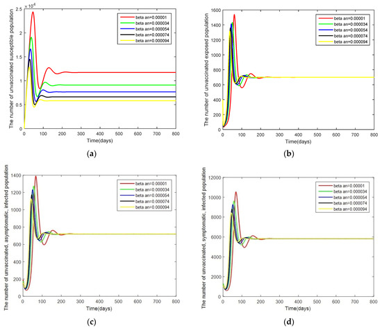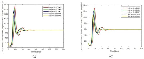 Graphs of the system of Equations (3)–(12) showing the comparison results of the infection rate of the asymptomatic, unvaccinated, infected population when : (a) the number in the unvaccinated, susceptible population; (b) the number in the unvaccinated, exposed population; (c) the number in the unvaccinated, asymptomatic, infected population; and (d) the number in the unvaccinated, symptomatic, infected population.