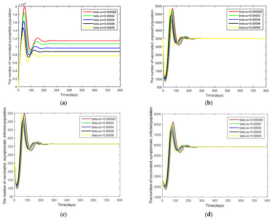 Graphs of the system of Equations (3)–(12) showing the comparison results of the infection rate of the asymptomatic, vaccinated, infected population when : (a) the number in the vaccinated, susceptible population; (b) the number in the vaccinated, exposed population; (c) the number in the vaccinated, asymptomatic, infected population; and (d) the number in the vaccinated, symptomatic, infected population.