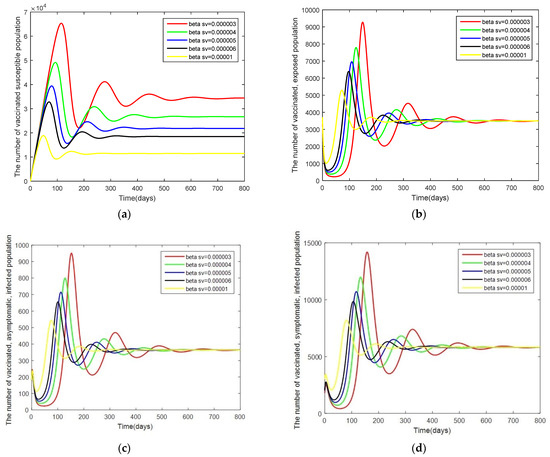 Graphs of the system of Equations (3)–(12) showing the comparison results of the infection rate of the symptomatic, vaccinated, infected population when : (a) the number in the vaccinated, susceptible population; (b) the number in the vaccinated, exposed population; (c) the number in the vaccinated, asymptomatic, infected population; and (d) the number in the vaccinated, symptomatic, infected population.