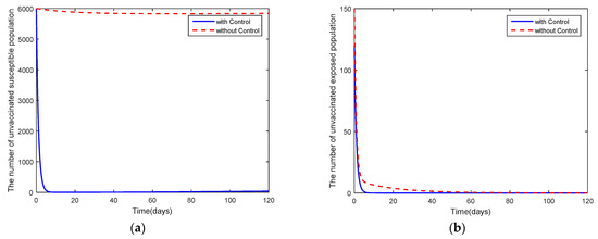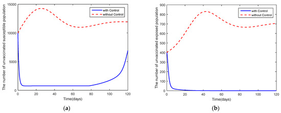 Graphs of the system of Equations (3)–(12) showing the comparison results of efficacy of vaccination when : (a) the number in the unvaccinated, susceptible population; (b) the number in the unvaccinated, exposed population; (c) the number in the unvaccinated, asymptomatic, infected population; and (d) the number in the unvaccinated, symptomatic, infected population.