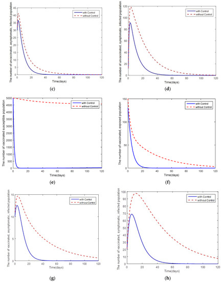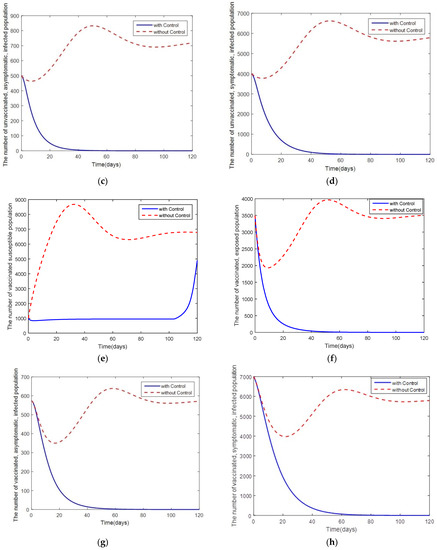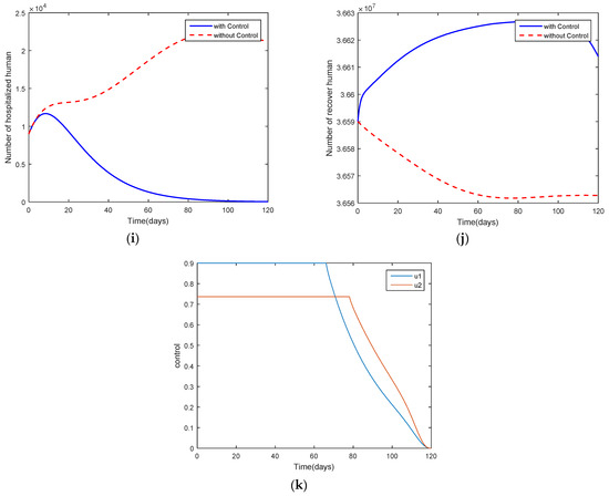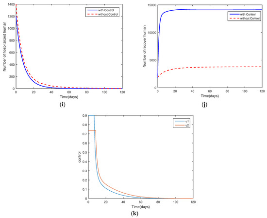 Comparison between the cases with control and the cases without control for the disease-free: (a) the number in the unvaccinated, susceptible population; (b) the number in the unvaccinated, exposed population; (c) the number in the unvaccinated, asymptomatic, infected population; (d) the number in the unvaccinated, symptomatic, infected population; (e) the number in the vaccinated, susceptible population; (f) the number in the vaccinated, exposed population; (g) the number in the vaccinated, asymptomatic, infected population; (h) the number in the vaccinated, symptomatic, infected population; (i) the number in the hospitalized population; (j) the number in the recovered population; and (k) control efforts and .