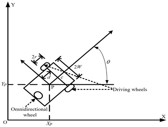 where and are the right and left wheel torques, respectively, stands for the mass, is the distance between P and c, is the inertia, and is the heading angle. In this investigation, the system parameters (, , ) are uncertain due to modeling perturbations representing variations in payloads .