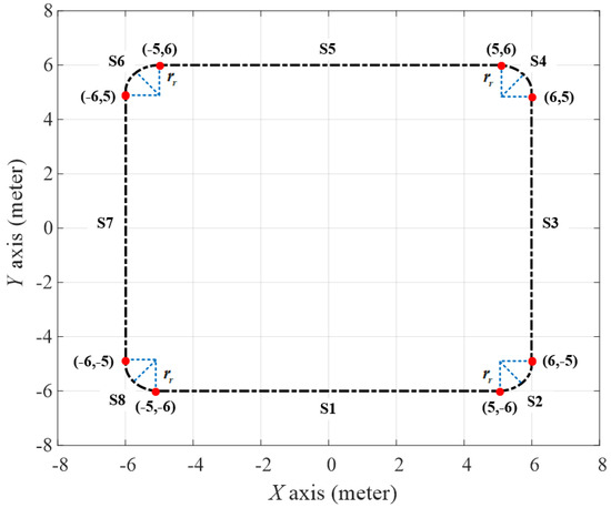 One testing scenario using a square-type trajectory is adopted for verifying the tracking ability of the proposed method in this section. The desired square-type trajectory has four straight lines and four corners. Details of this trajectory will be presented mathematically later. In addition, the trajectory tracking performance of this proposed method is verified using MATLAB software, version 2021b.