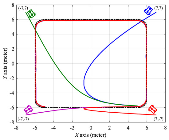 In this control trajectory tracking verification, four AMRs are chosen; the velocity and the radius are set up as 0.8 m/s for 1 m, respectively. As to the rotation angle , for i = 1, …, 4 can be calculated via integrating , as depicted in the above equations. The control parameters of this proposed method are gained from Equations (67)–(69).