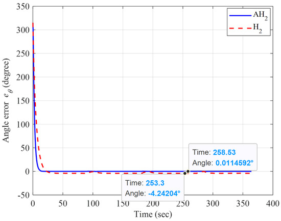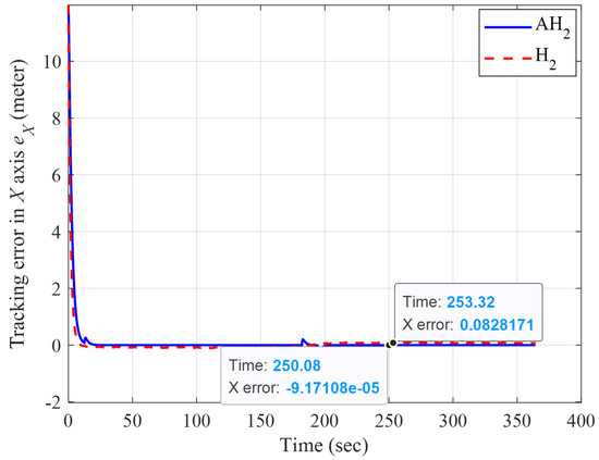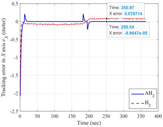 Tracking errors, including errors (, , ), for , in the X-axis, Y-axis, and the heading angle of the individual AMR are illustrated in the following figures. Figure 5, Figure 6 and Figure 7 depict the histories of tracking errors , , and for the #1 AMR, using the AH2 and H2 method. From these tracking results, it is easy to establish that the trajectory tracking performance of the H2 method is worse than the proposed AH2 method because of the existence of steady state errors in , , and under the effects of the 20% modeling uncertainties caused by Δm. The trajectory tracking errors , , and of the #1 AMR, which converge to almost zero, can be transparently observed from Figure 5, Figure 6 and Figure 7. Similar tracking results can be found from Figure 8, Figure 9, Figure 10, Figure 11, Figure 12, Figure 13, Figure 14, Figure 15 and Figure 16 for #2 AMR, #3 AMR and #4 AMR. From these results, the proposed AH2 method obviously outperforms the H2 method.