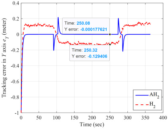 The square trajectory tracking error result of the adaptive H2 closed-form and H2 closed-form control approach for the y-axis from xp = −7 m, yp = −7 m.