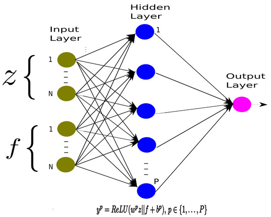 Figure 1 defines the architecture we implement for our DRL NN. The DRL NN has as input the vectors z and f, representing the customers’ delivery ordering and the ODs compensation vector; only one P hidden nodes layer with ReLU activation, and one linear output. Let represent the weights vector and the bias term for the p-th hidden node. We define and analogously for the output layer.