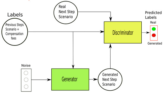 Figure 2 presents an overview of the cGAN. The cGAN englobes two neural networks, the generator and the discriminator. These NNs learn simultaneously in an adversarial process, with a two-player minimax game. First, we perform the conditioning by feeding the label representing the previous scenarios and compensation fees defined, into both the discriminator and generator as an additional input layer. The generator has the noise vector as input, which is sampled from a mean 0 and standard deviation 1 Gaussian distribution and forecasts with regard to the conditioning label. The discriminator has as input and verifies whether it is a valid value to follow the label or not. The discriminator is optimized to distinguish between generated data and real data.