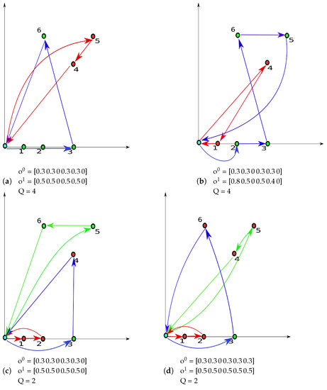 Figure 3 presents four instances indicating six customers’ positions in a graph, the best-constructed routes defined for a scenario where all customers have online orders and no ODs available, and what level of compensation was paid for each customer being outsourced, as in the solution of our algorithm.