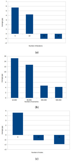 In this section, we analyze the effect of changing the number of policy iterations, the number of training scenarios, and the number of the NN hidden layer nodes on the solution quality presented as the percentage average gap between the total cost output of the simulation running the first-stage solution provided with new parameters, as compared to first-stage solution run with default parameters. We change each of the parameters independently while maintaining the other parameters as default. This is reported in Figure 4a–c, respectively.