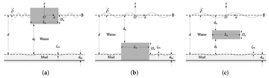 In the present wave–obstacle–mud problem, we adopted the two-layer system commonly used in the studies of wave–mud interactions [66], as shown in Figure 1. The upper layer is typical sea water and the bottom muddy seabed, which lays on an impermeable solid bed, is idealized by a Newtonian fluid. A fixed solid obstacle in the shape of a rectangle was considered. Three different settings were examined: a surface obstacle that is sufficiently high so that no wave overtopping is possible (Figure 1a); a bottom obstacle sitting on the solid bed and penetrating through the water–mud interface (Figure 1b); a submerged obstacle resting internally in the water layer (Figure 1c).