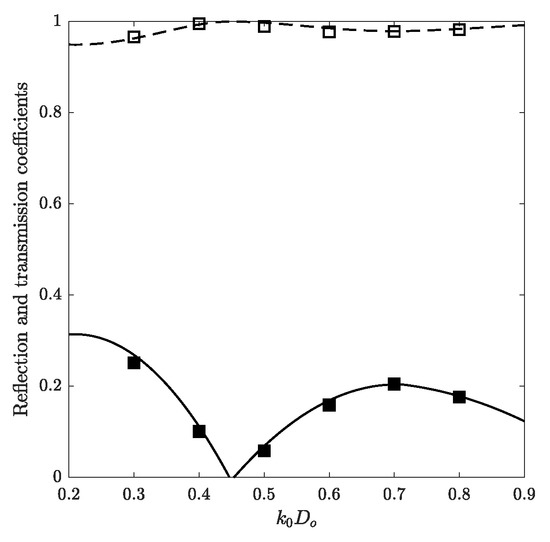 Wave scattering by a surface obstacle above a solid bed: reflection (■; solid line) and transmission (□; dashed line) coefficients. Symbols: present numerical results. Lines: analytical predictions reported in the literature [7]. represents the wavenumber of incident waves. m are used in this example. See Figure 1a for the problem sketch.