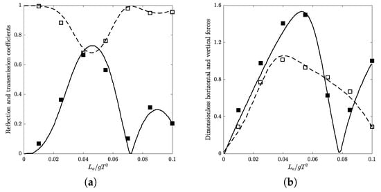 Wave scattering by a submerged obstacle above a solid bed: (a) reflection (■; solid line) and transmission (□; dashed line) coefficients; (b) dimensionless horizontal (■; solid line) and vertical (□; dashed line) forces acting on the obstacle, as defined in (2) and (3), respectively. Symbols: numerical simulations. Lines: analytical results reported in the literature [11]. In this case, m and the incident wave period is s. See Figure 1c for the problem sketch.