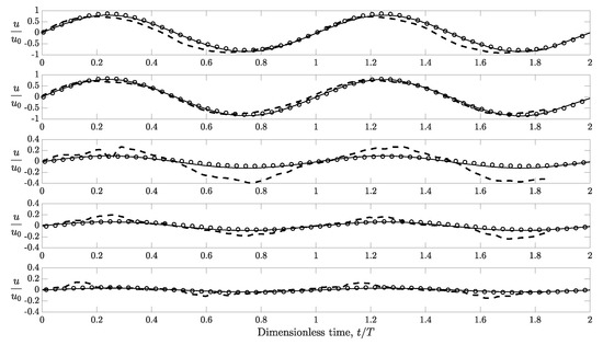 Time histories of horizontal velocity, u, at five different elevations. The velocity is normalized by the characteristic wave-induced velocity, . The first and the second panels show the results at 0.04 and 0.01 m above the initial water–mud interface, respectively. The remaining three panels, from top to bottom, plot the velocity at 0.025, 0.06, and 0.09 m below the interface. Circle: present numerical results. Dashed line: laboratory data [76]. Solid line: existing analytical solutions [68]. In this example, s, m, m, m, m2/s, kg/m3, and m/s. Records of experimental data were slightly less than two wave periods.